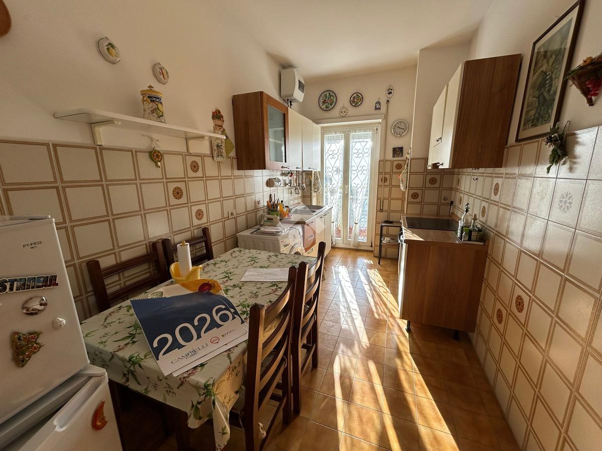 Saliti al quinto piano, mediante l’ascensore, e varcata la porta di accesso dell’immobile si accede subito all’ingresso dove, alla sua sinistra, troviamo un comodo ripostiglio. Il primo ambiente della casa che incontriamo è la cucina separata abitabile di 10 mq, con accesso diretto mediante porta finestra al balcone abitabile, da cui si può accedere sia dalla cucina che dalla zona giorno.
