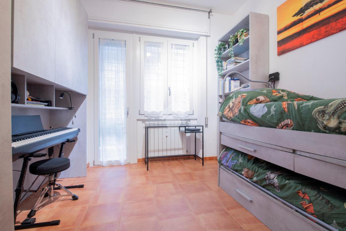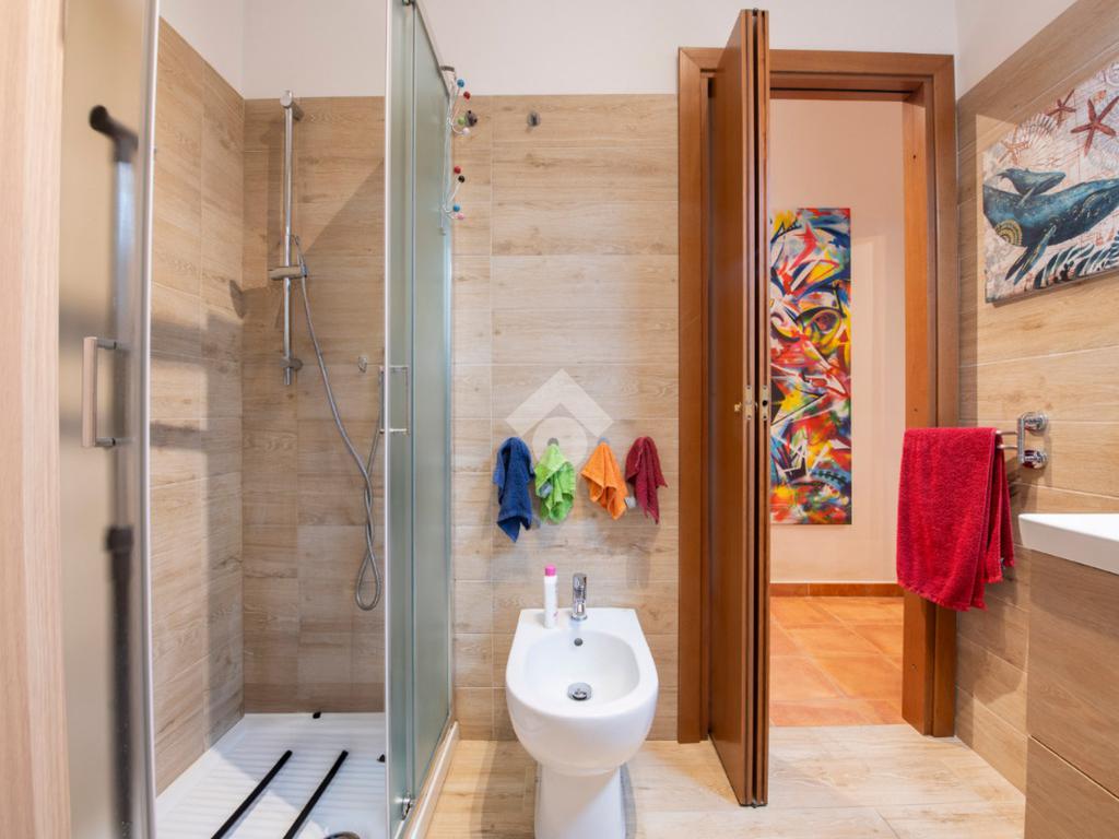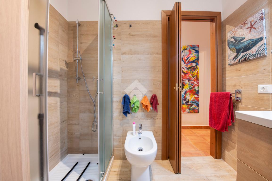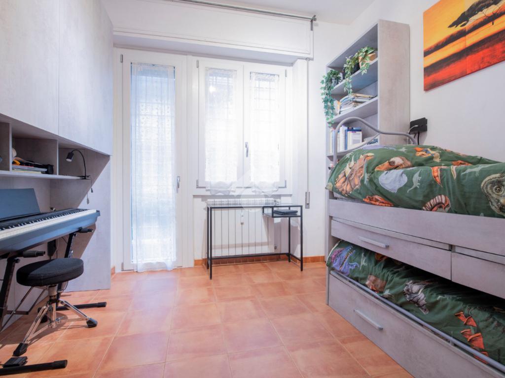 Il disimpegno divide la zona notte composta da una camera da letto matrimoniale di 14 mq. Il bagno presenta un ampio box doccia con finestra.