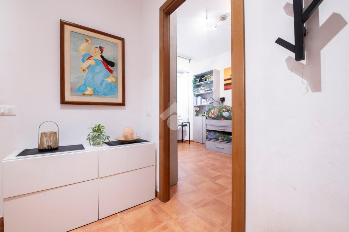 Varcata la porta di accesso della casa veniamo accolti nell’ingresso alla sinistra del quale si sviluppa l'accogliente zona giorno con cucina a vista.
